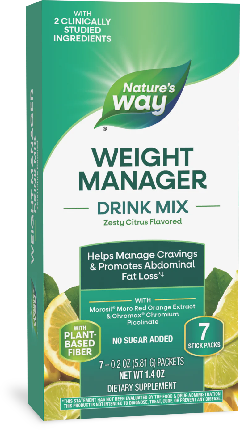 Nature’s Way Weight Manager is the perfect partner for your weight loss journey. This daily powder supplement helps manage cravings and promotes abdominal fat loss with clinically studied Morosil Moro red orange extract and Chromax chromium picolinate.*‡ Weight Manager supports blood sugar metabolism and provides a good source of fiber per serving to support digestive health.* High potency vitamins B6 and B12 per serving support energy metabolism.* Stay focused on your goals with convenient, sugar-free powder packets for travel or on-the-go use or a tub for at home.